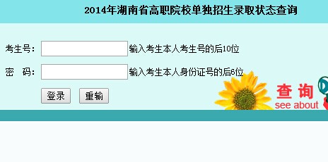 湖南省招生考试信息港http://www.hneeb.cn/: 湖南招生信息港2014: 点击登录: 湖南招生信息港录取查询系统 下方为2014年湖南省高职院校单独招生录取状态查询入口图示: